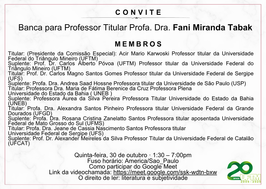 No dia 30 de outubro, das 13h30 às 19h, acontecerá a banca de promoção à Classe E de Professor Titular da Carreira do Magistério Superior da docente Fani Miranda Tabak. A...