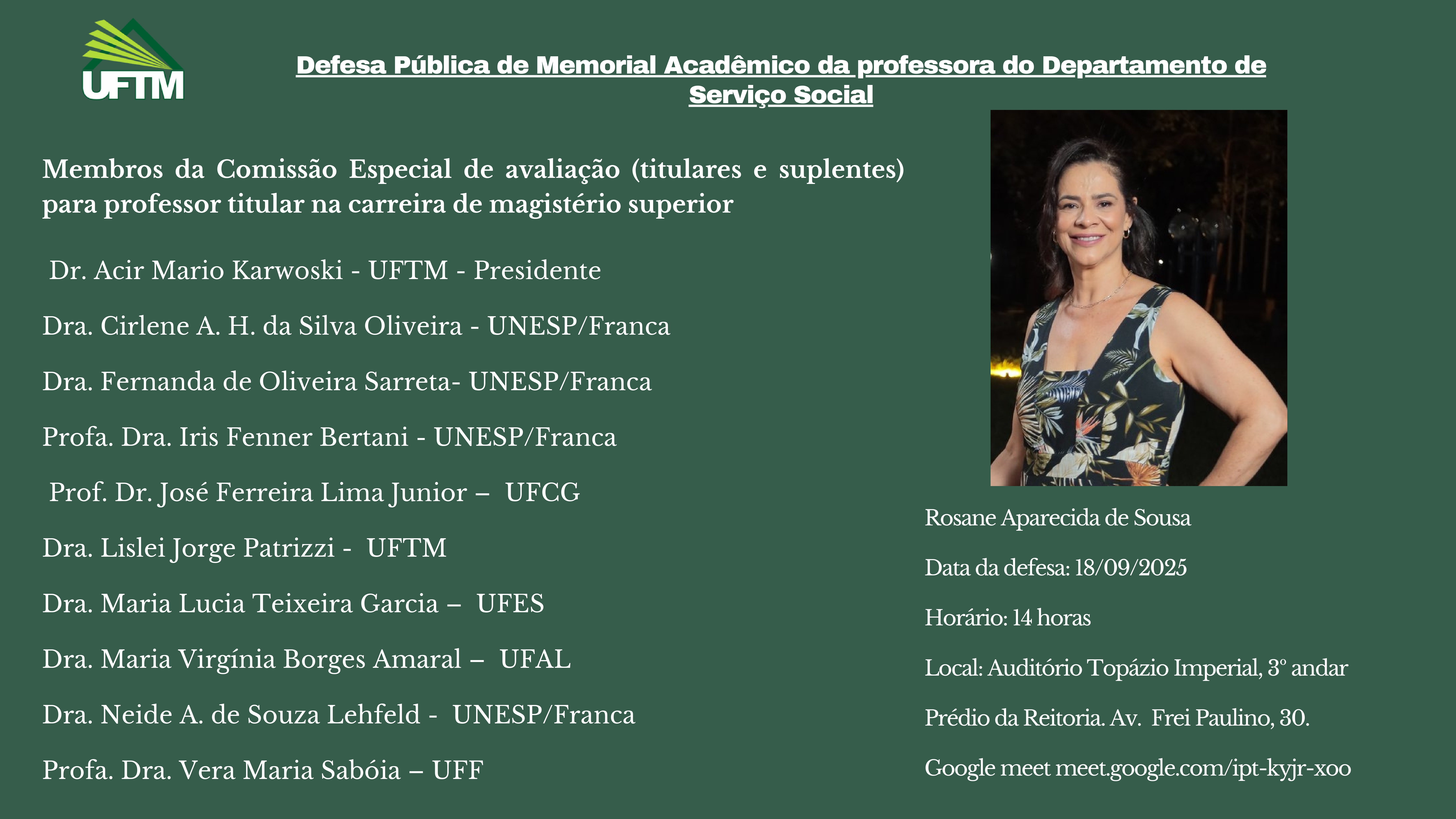 O Departamento Didático-Científico de Serviço Social da Universidade Federal do Triângulo Mineiro convida convida a comunidade acadêmica e interessados para a Defesa Pública de...