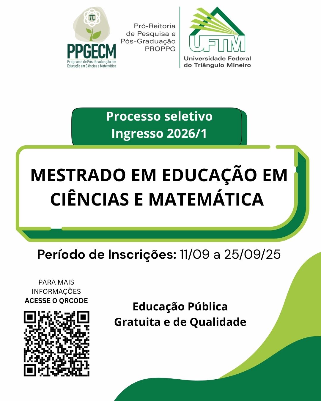 De 11 a 25 de setembro estarão abertas as inscrições para o Programa de Pós-Graduação em Educação em Ciências e Matemática (PPGECM) da Universidade Federal do Triângulo...
