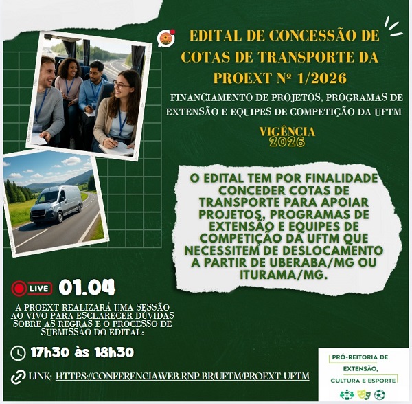 A Pró-reitoria de Extensão, Cultura e Esporte (PROEXT) da Universidade Federal do Triângulo Mineiro publicou, em 25 de março de 2026, o Edital de Concessão de Cotas de Transporte...