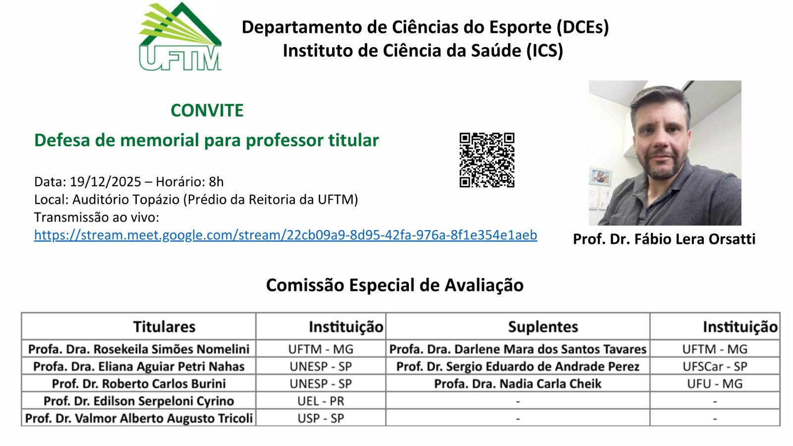 O Departamento de Ciências do Esporte da Universidade Federal do Triângulo Mineiro (UFTM) convida  a comunidade acadêmica e interessados para a defesa pública do Memorial do...