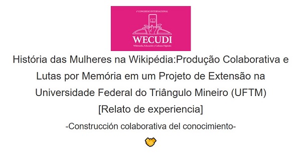 A docente Ilana Peliciari Rocha, do curso de História da UFTM, apresentou um Relato de Experiência do projeto de extensão “História das Mulheres na Wikipédia: Produção Colaborativa e Lutas por Memória em um Projeto de Extensão na Universidade Federal do Triângulo Mineiro (UFTM)” no 2º Congresso Internacional WECUDI 2025 – Wikimedia, Educação e Culturas Digitais, realizado entre 29 e 31 de outubro, na Cidade do México.