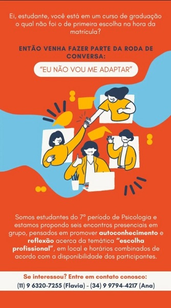 Um grupo de seis estudantes de Psicologia da UFTM, como parte da disciplina de Teorias e Práticas de Grupos, organizam uma roda de conversa com o tema "Eu não vou me adaptar", coordenada pelo docente Tales Vilela Santeiro. O local e horários serão estabelecidos de acordo com a disponibilidade dos participantes e dos coordenadores. Ao todo, serão seis encontros presenciais.