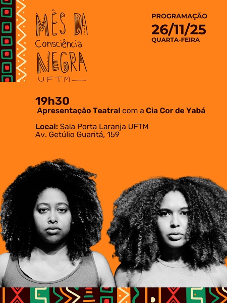 A Universidade Federal do Triângulo Mineiro (UFTM) recebe, no dia 26 de novembro, às 19h30, na Sala Porta Laranja, o espetáculo “Amarelo é a Cor da Fome”, da Cia Cor de Yabá. Inspirado na obra Quarto de despejo: o diário de uma favelada, de Carolina Maria de Jesus, o espetáculo integra a programação do Mês da Consciência Negra. A apresentação é gratuita e aberta ao público em geral, sendo o acesso sujeito à lotação da Sala Porta Laranja.