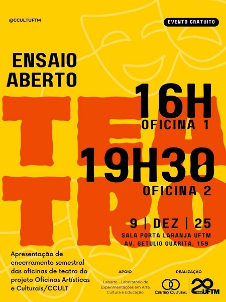 A Universidade Federal do Triângulo Mineiro (UFTM), por meio do Centro Cultural e da Pró-reitoria de Extensão, Cultura e Esporte (PROEXT), realiza no dia 9 de dezembro, na Sala Porta Laranja, o Ensaio Aberto das Oficinas de Teatro do projeto de extensão Oficinas Artísticas e Culturais.
