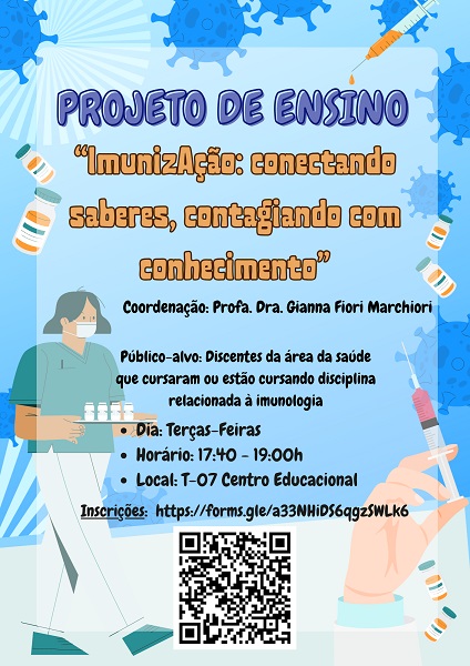 O Projeto de ensino “ImunizAção: conectando saberes, contagiando com conhecimento”, coordenado pela professora Gianna Fiori Marchiori, do Departamento de Enfermagem em Educação e Saúde Comunitária – DEESC, está com inscrições abertas.